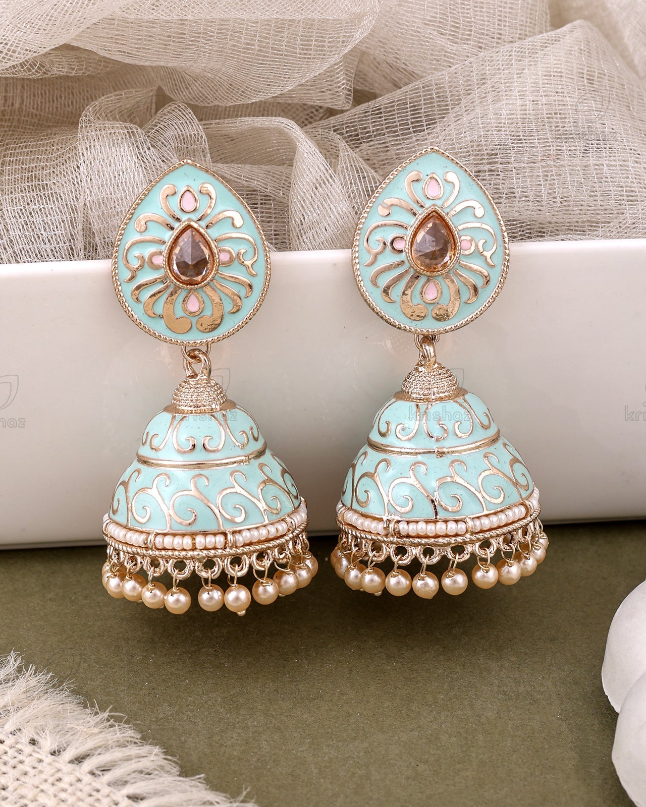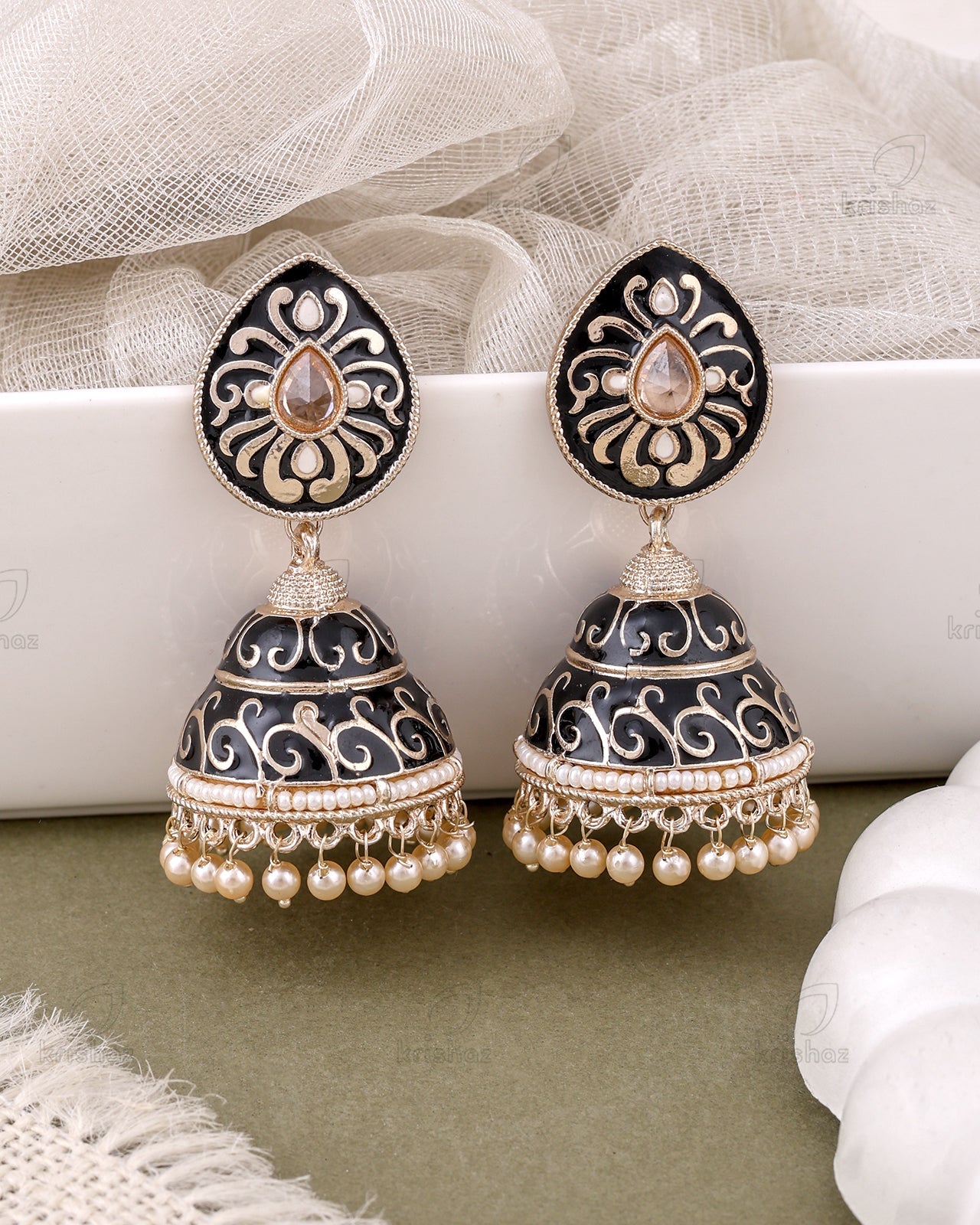 Step up your jewelry game with our Alisha Kundan Jhumki. The intricate Meenakari work and stunning stone accents add an exotic touch to any outfit. Elevate your look and make a statement with this unique and beautiful piece.