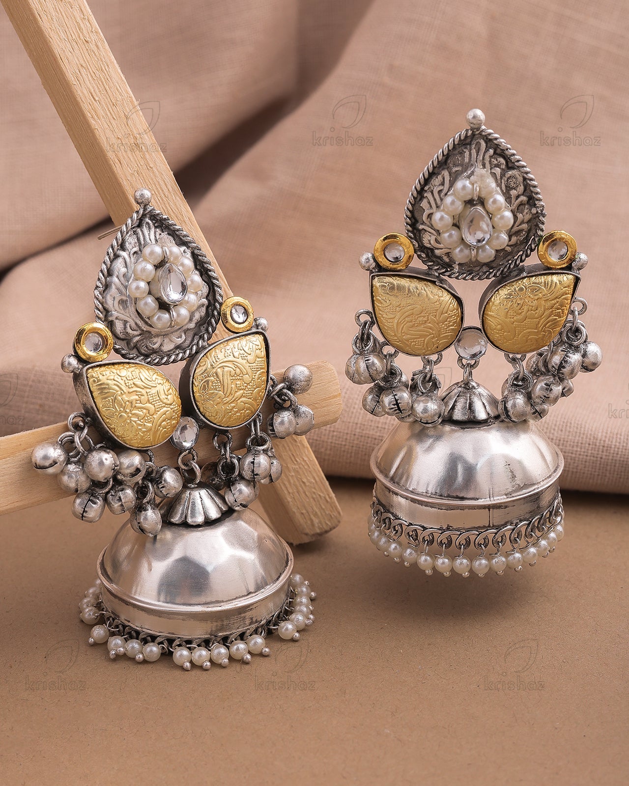 Enhance your traditional look with Arunya Jhumki Earrings. Made of silver oxidized metal, these elegant earrings feature two-tone and ghungroo work for a unique touch. The long jhumki design adds a graceful flair, while the pearl work adds a touch of sophistication. Perfect for any occasion.