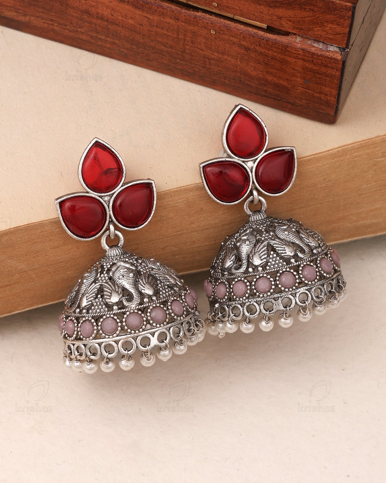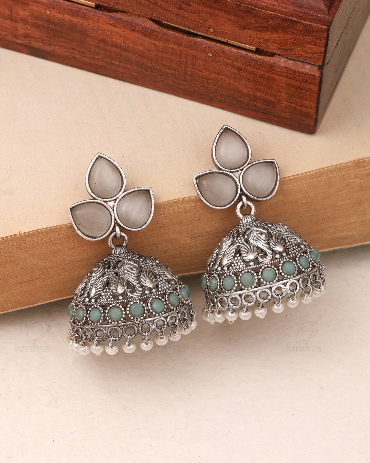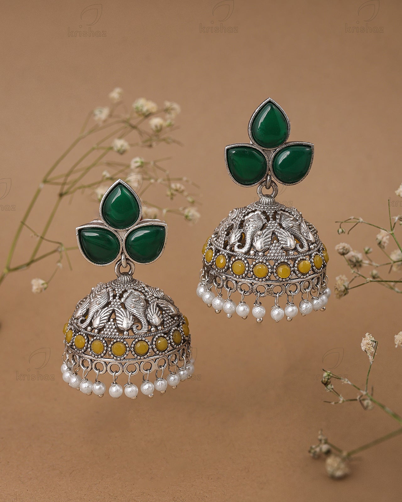 Enhance your traditional and ethnic look with the exquisite Mayuksh Jhumki Earrings. These silver oxidized earrings feature a trendy elephant design, adorned with pearl work and colored stones. Elevate your style with the perfect combination of tradition and trend.