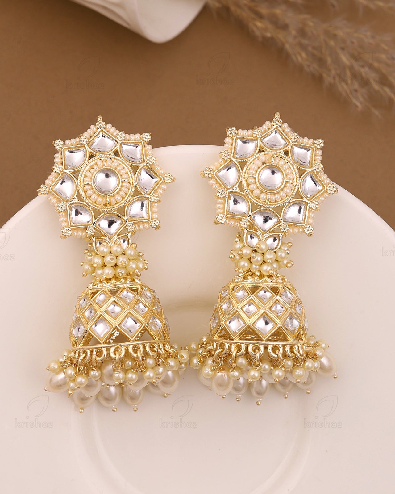 Add some traditional charm to your look with these Kundan Jhumki. Featuring exquisite Kundan and Pearl detailing, these earrings will elevate any outfit with their unique design. Embrace your cultural roots with this playful accessory.