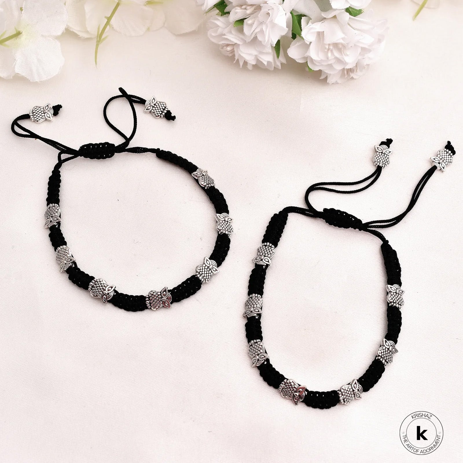Beautifully handmade from Krishaz, these Parul Silver Oxidized Owl Patterned Thread Anklets will give you an ethnic and traditional look. The silver-oxidized design is sure to grab attention and features intricate owl patterning for a unique touch. Nazarbattu anklets complete the look and are sure to provide timeless elegance to any outfit.