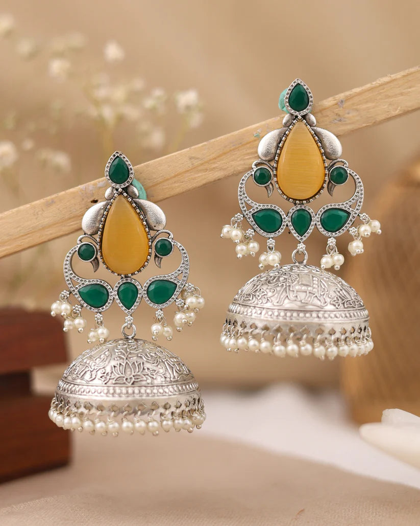 Saanjh Jhumki Earrings feature a striking peacock pattern crafted in silver oxidized metal, embellished with vibrant artificial stones. These colorful earrings blend traditional artistry with elegant design, making them a perfect accessory to enhance ethnic outfits with a touch of cultural sophistication.