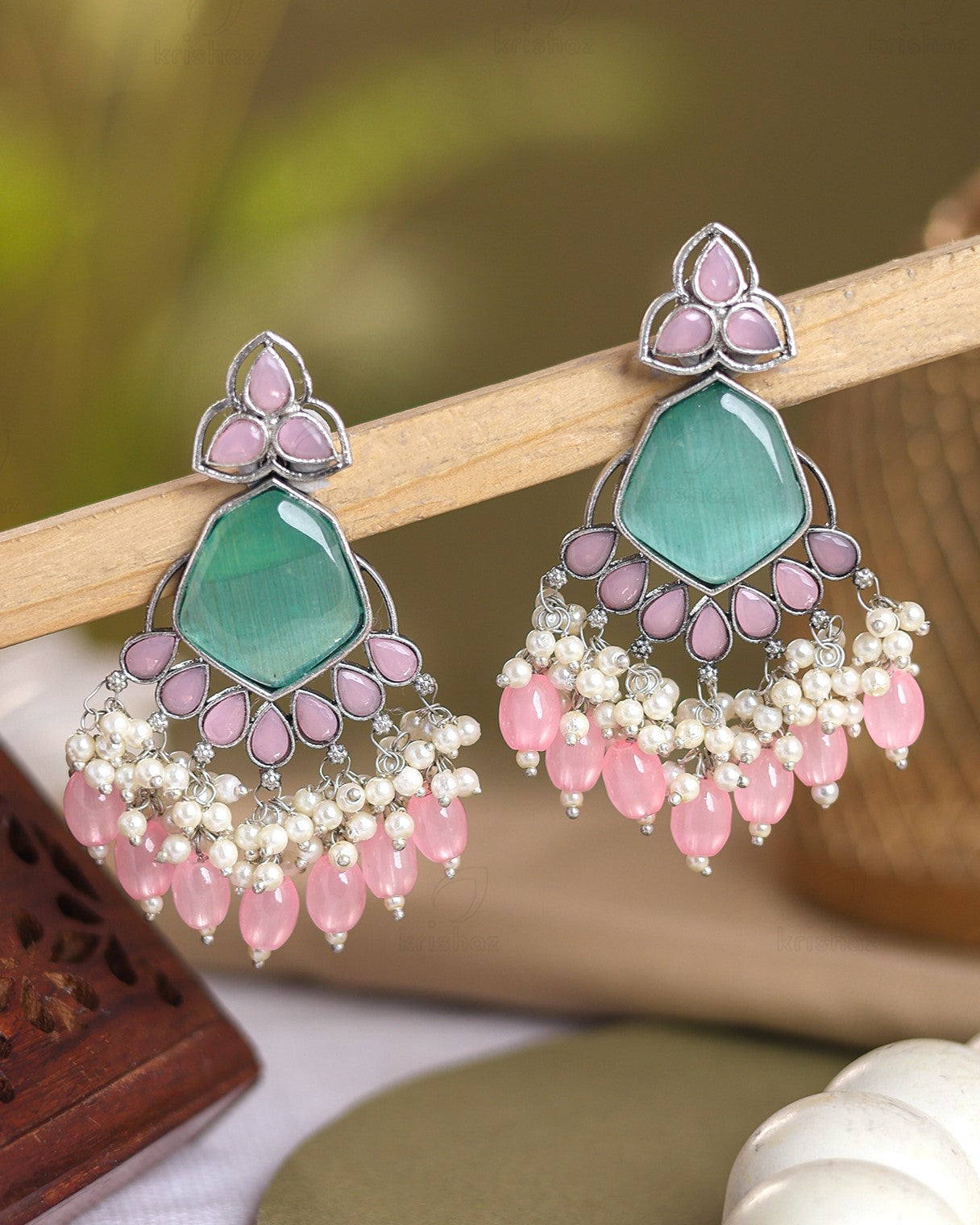 These Yukta Dangler Earrings feature beautiful traditional colorful stones and pearls on oxidized silver danglers. Elevate any outfit with these elegant and timeless accessories. Handcrafted with expert craftsmanship and quality materials, these earrings make the perfect addition to any jewelry collection.